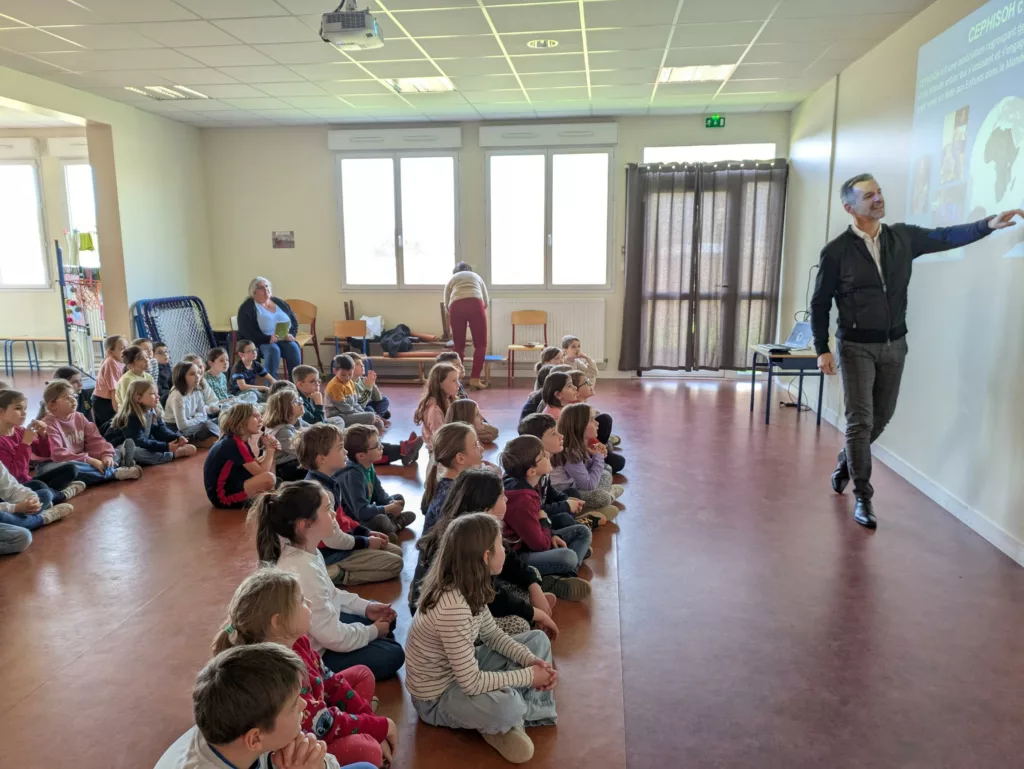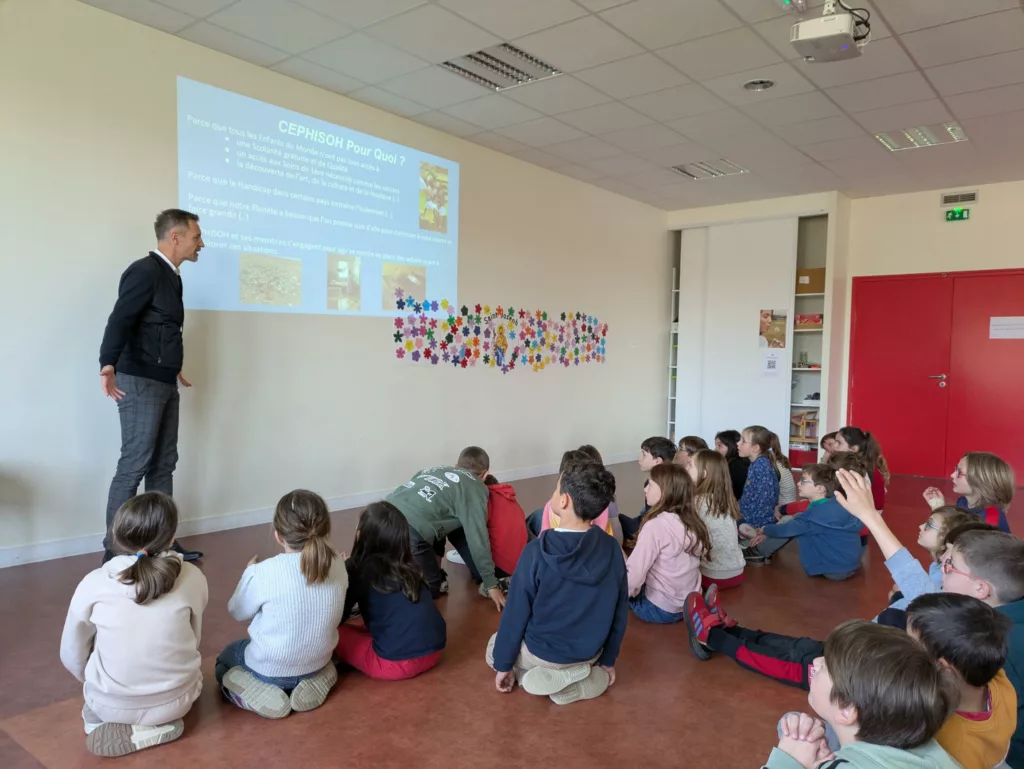 Ce mardi 24 mars, deux membres de l’association CEPHISOH, (Collectif pour l’Enfance, le Partage Humanitaire, l’Intégration, la Solidarité et l’Ouverture au Handicap), basée à Grandchamp, sont venus présenter aux élèves des classes élémentaires, les actions entreprises pour venir en aide aux enfants dans le Monde et particulièrement en Afrique. M. Philippe Briois, créateur de ce collectif a donné les raisons de ce projet humanitaire :