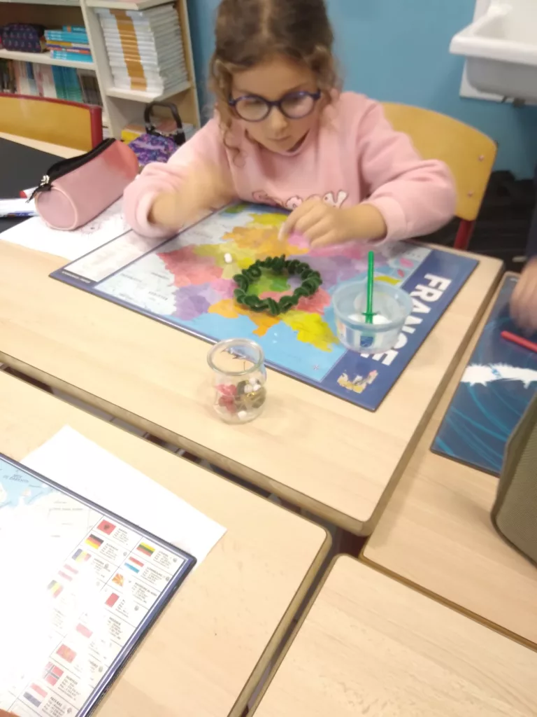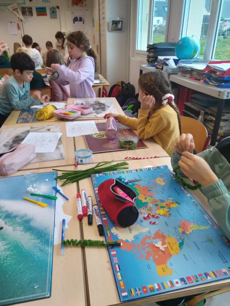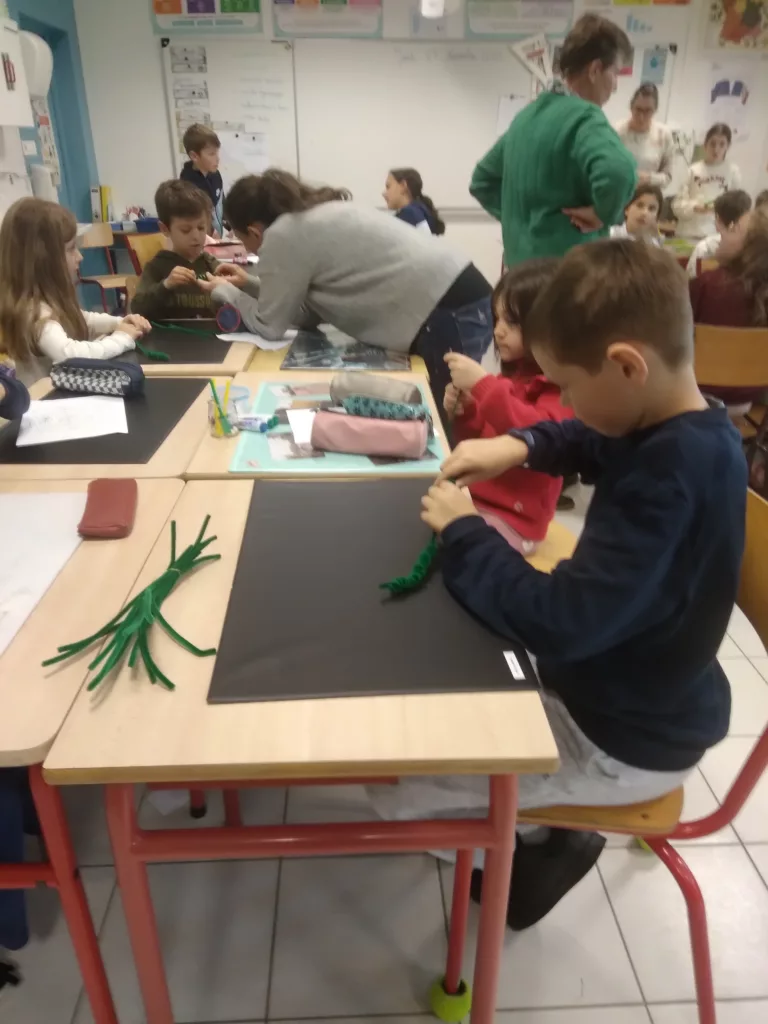 Le jeudi 27 novembre, toutes les classes du PS au CM2, ont consacré une heure à la réalisation de décorations de Noël, dans la perspective du marché de Noël, organisé par l’APEL. Depuis maintenant trois ans, les classes se regroupent en binôme de parrainage pour ce projet. C’est ainsi que les élèves de CM2 se retrouvent avec ceux de CP systématiquement. Accompagnés par des parents et des grands-parents, cette animation perpétue l’entraide générationnelle et contribue à nos valeurs communes, développées dans le projet d’école.