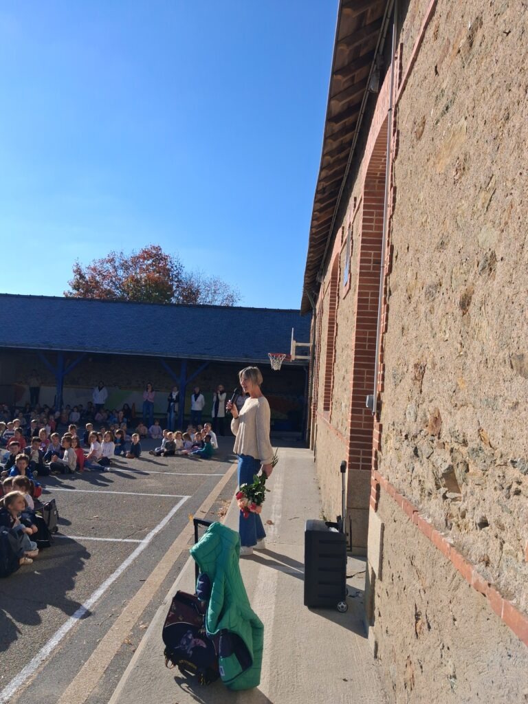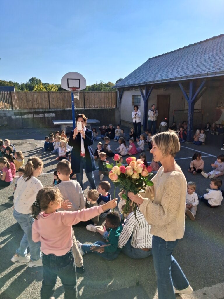 Ce mardi 14 octobre, c’était le dernier jour de classe pour Claudie, l’une des deux enseignantes de la classe de PPS/PS. Trente années se sont écoulées depuis ses premiers jours d’enseignement à St Joseph et son investissement a toujours été remarquable au profit des élèves et de l’établissement. Lors de ses derniers instants, l’ensemble des élèves a repris en choeur, une comptine gestuelle, sur la cour des CE/CM et deux élèves de chaque classe lui ont apporté une rose pour la remercier de toutes ces années. Bon vent Claudie et Merci !