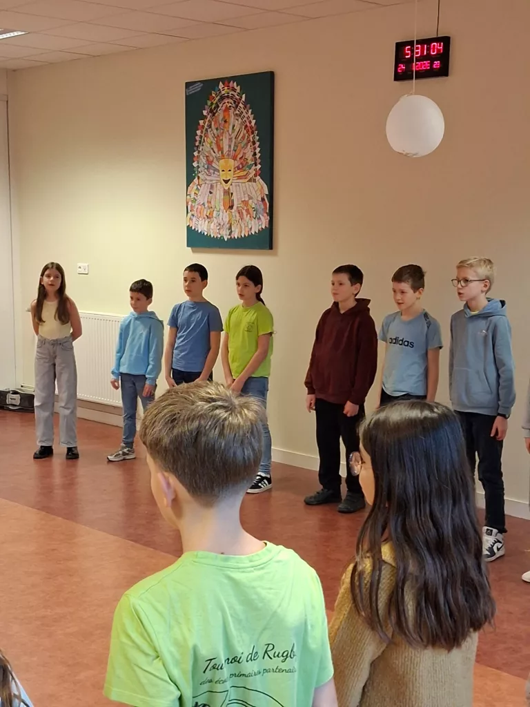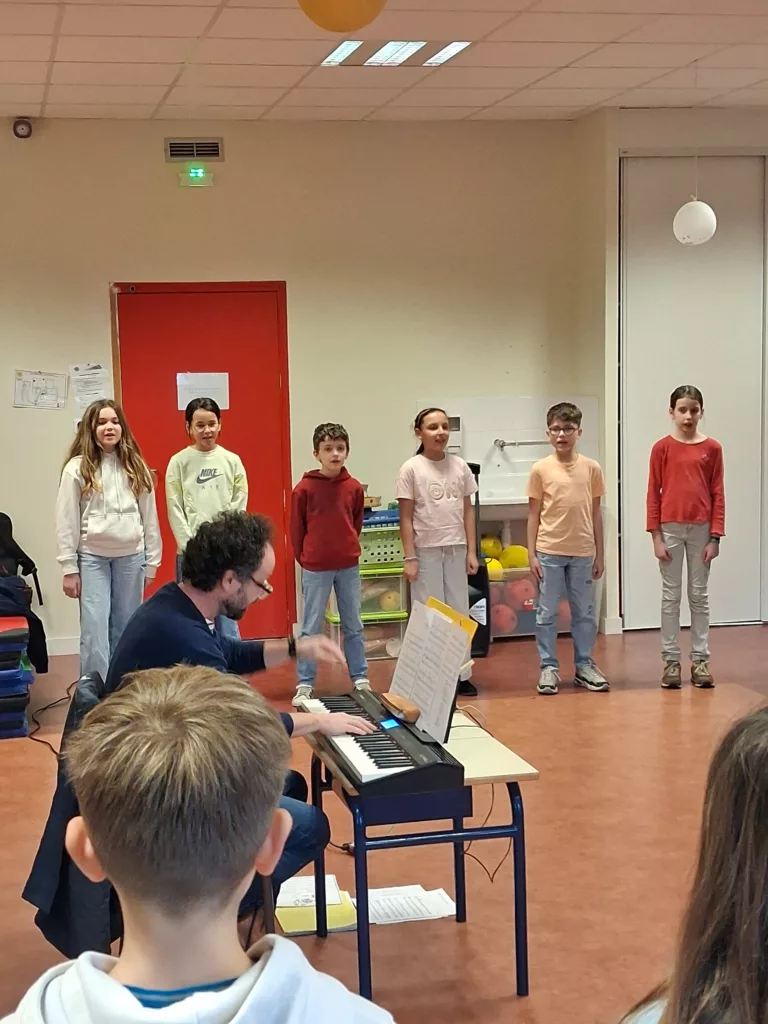 Comme chaque année, lors de nos Portes Ouvertes, une chorale a animé cet événement important pour notre communauté éducative. Ainsi, ce vendredi soir 23 janvier, les élèves du cycle 3, des classes de CE2/CM1, CM1 et CM2 ont interprété un répertoire de chansons des Enfantastiques, sur le thème de l’empathie, de la solidarité et de la fraternité entre les peuples. Ce thème correspond au projet d’école de l’année « Faisons corps ensemble ». Sous les applaudissements de leurs familles venues les applaudir, dans la salle de motricité, les élèves ont brillamment relevé le défi d’apprendre trois chants en seulement cinq séances d’apprentissage, sous la direction de Vincent Vaccaro, chef de choeur au sein de MIXT. Ce nouvel établissement public de coopération culturelle créé par le Département de Loire-Atlantique avec ses partenaires, la ville de Nantes, l’État et la région Pays de la Loire. Mixt déploie des projets de pratique artistique dans 150 écoles primaires de Loire-Atlantique, grâce à une équipe de 25 intervenants spécialisés en musique et en danse.
