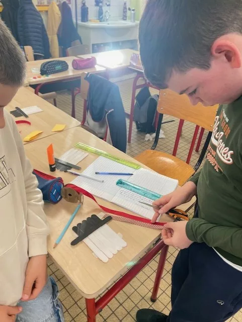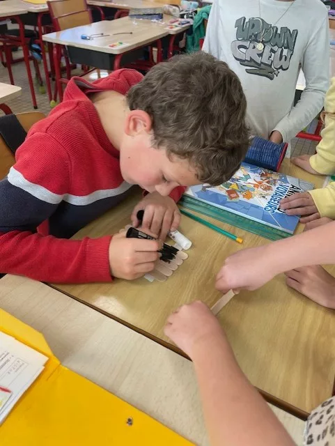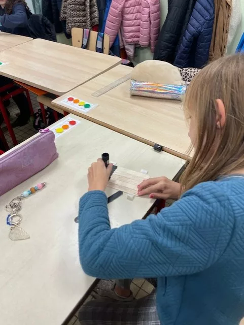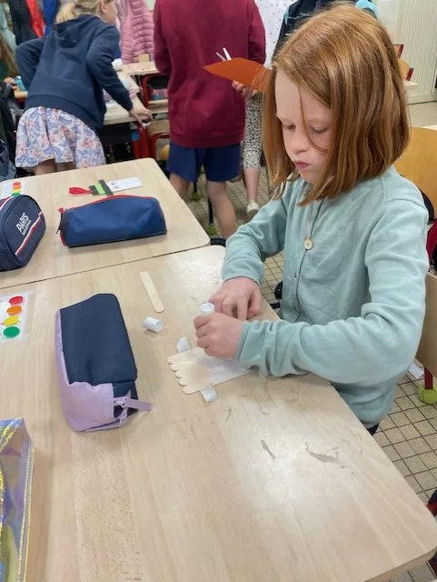 Pour commencer, les élèves se sont appliqués à faire un bricolage : un bonhomme de neige en bâtons !