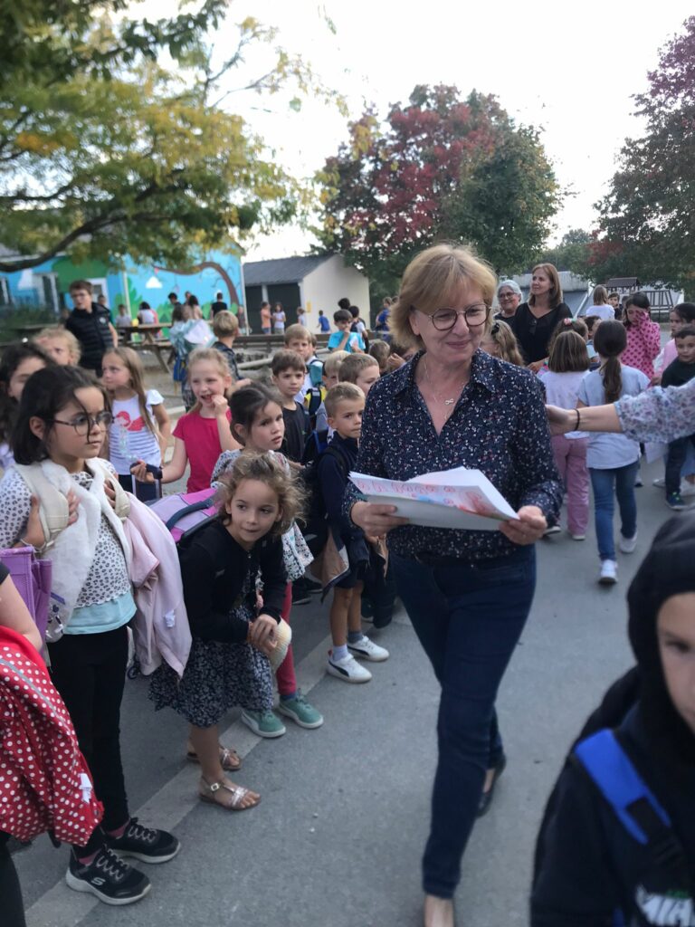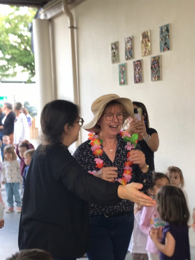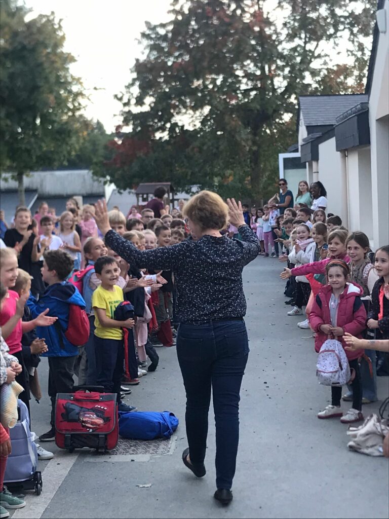Le mardi 30 septembre dernier, c’était le dernier jour d’école pour Hélène, l’enseignante de la classe de PS/MS. A la fin de la journée tous les élèves de l’école ont réalisé une grande haie d’honneur sur la cour de récréation. Hélène a ainsi pu savourer ces derniers instants à St Joseph de la plus belle des manières, en étant saluée et remerciée par tous les élèves. A la fin de ce tour d’honneur, un chapeau de paille a été déposé sur sa tête et une chaise longue l’attendait représentant symboliquement, cette nouvelle vie de détente, sans horaires de travail. Un grand merci Hélène pour toutes ces années au service des élèves de St joseph !